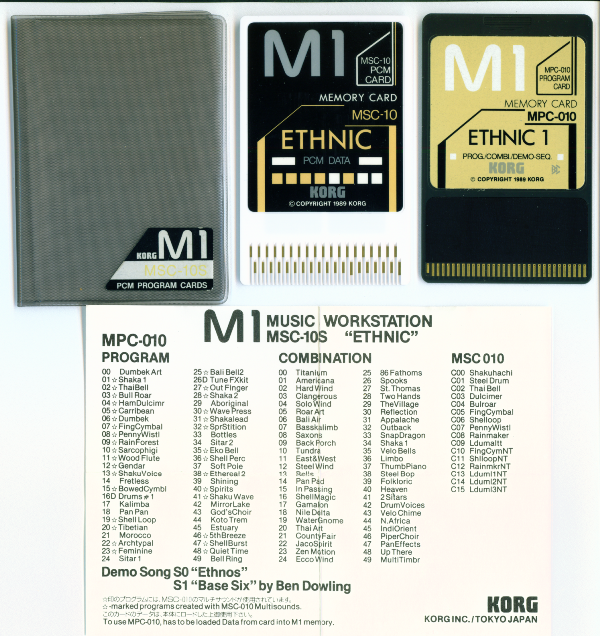 The MSC-10S "Ethnic 1" sound card set consists of the MPC-10 Program card, and the MSC-10 PCM card. These two cards install in the slots of the Korg M1 series, adding several new waveforms and programs to the machine. The MSC-10S Ethnic 1 card set focuses on Ethnic sounds of various origins. The new waveforms include Shakuhachi, Steel Drum, Thai Bell, Dulcimer, Bullroarer, Finger Cymbal, Shell Loop, Penny Whistle, Rain Maker, Dumbek, and variations with the fundamental tone removed. |