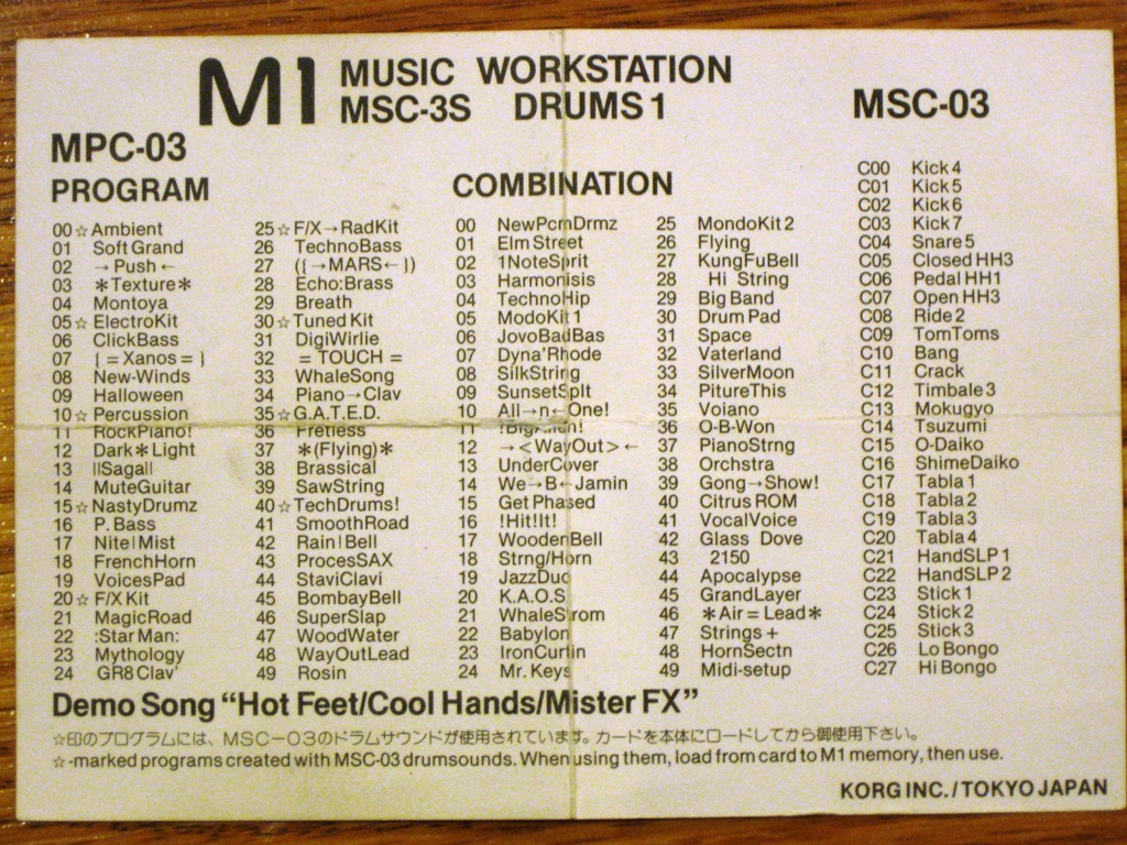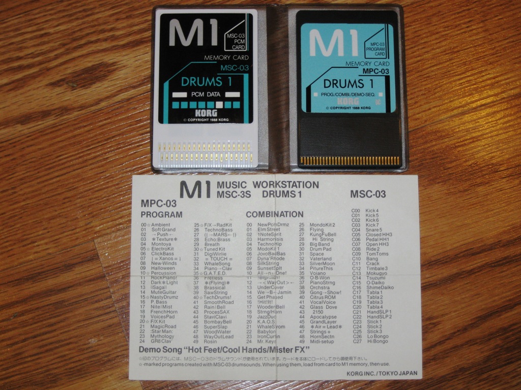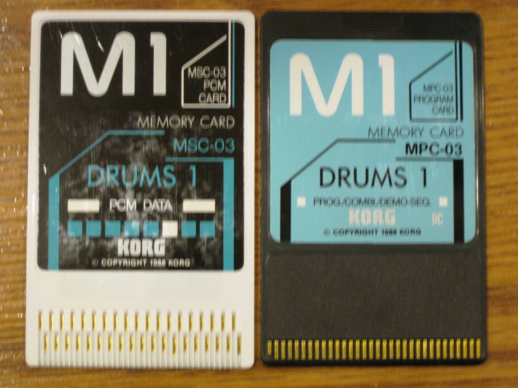 The MSC-3S "Drums 1" sound card set consists of the MPC-03 Program card, and the MSC-03 PCM card. These two cards install in the slots of the Korg M1 series, adding several new waveforms and programs to the machine. The Drums 1 card features new drum & percussion sounds, but also adds numerous new Programs and Combinations of other types of sounds, like electric pianos, basses, pads, strings etc. The drum sounds improve on the stock M1 drum samples. |