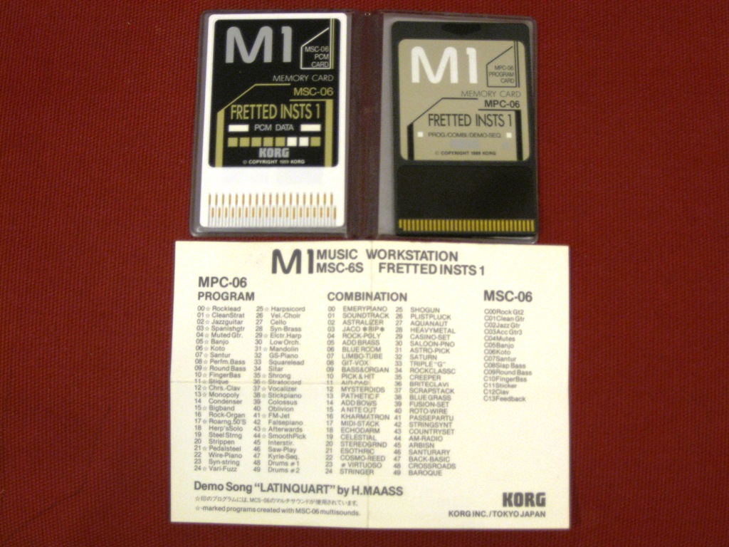 The MSC-6S "Fretted Instruments 1" sound card set consists of the MPC-06 Program card, and the MSC-06 PCM card. These two cards install in the slots of the Korg M1 series, adding several new waveforms and programs to the machine. I find this card set to be very skillfully programmed. The core of the new samples includes new guitar (electric and acoustic), bass, banjo, and even great-sounding middle-eastern stringed instruments. |